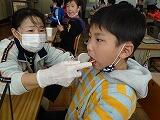 養護教諭による「6歳臼歯を磨こう!」の授業風景です
