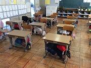 避難するときの赤白帽子の被り方、机の下への避難の仕方などを学びました。