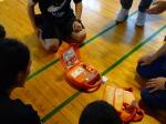 心肺停止状態の人(練習用の人形)が倒れている想定で、心臓マッサージをしながらAEDの到着を待ち、練習用AEDを実際に使うという内容でした。