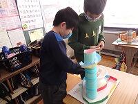 「コロがるくんの旅」の学習で、ビー玉をころがすおもちゃを作成しています