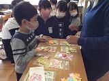 ALTの先生に「I want yellow star」や「I want red heart」など、ほしい図形と数を英語で伝え、友達や家族に感謝を伝えるオリジナルのカードを作りました。
