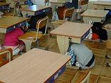 各教室で緊急地震速報を聞き、素早く身を守る訓練です。