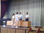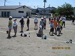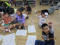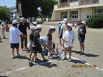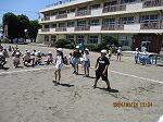 昨日の雨天とは打って変わって、暑い日差しが降り注ぐ中、なかよし班活動が行われました。普通のドッジボールとルールは同じですが、今回は当たったらその場で自己紹介をします。所属学級、名前、好きな○○をグループのみんなに言いました。
