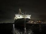 漆黒の海に浮かぶライトアップされた日本郵船氷川丸がお出迎え。