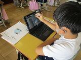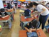 2年生で、タブレットを使っての授業を行いました。図形の学習で、三角形、四角形に仲間分けをする授業です。タブレット上で、直線を引いたり、図形を動かして仲間分けしたりしました。めあてに向け、それぞれが活動していました。