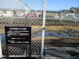 本校の特徴の1つでもあるビオテープ。年月がたち、水の濁りや木の枠の老朽化が見られました。そこで、「学校環境緑化モデル事業」として、ビオトープの改修を行っています。おおよその工事が終わり、新しいビオトープがもう少しで完成です。