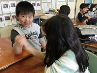 席を移動する前に、隣の友達に最後のあいさつ。指相撲であいさつをする人も。