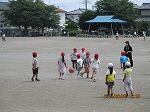 昼休みの校庭の様子です。職員室から外を眺めていると、担任の先生の後に続き、1年生が列を作り、ドッジボールのコートを引き始めました。まるでカルガモの親子のようで、微笑ましい光景でした。(見とれていたため、写真はありません)