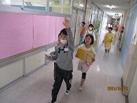 避難訓練が終わって全校児童が教室へ戻る前、環境委員会は上履きをきれいにするためのぞうきんを準備しました。環境委員会のみなさん、ありがとうございました。