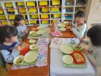 配膳の仕方にもだいぶ慣れ、グループで楽しく食べています。
