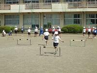 2年生の合同体育です。今日はハードルリレーをやりました。みんなとても上手になりました。