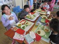 四小で作った給食は、おいしくて、もりもり食べてています。