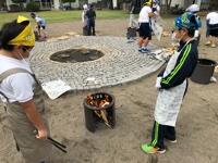 かまど班は、かまどに火をつけます。