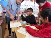 四小タイムは体育館で、先週のピーテー祭で掲示した習字と共にパチリ。