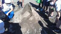 はじめは、「砂山作るの久しぶり!」「大きくても崩れないように作るぞ!」と、理科の時間ということも忘れるくらい砂山作りに熱心に取り組んでいました。しかし、川となる溝に水を流してみると、砂がたまってうまく流れなかったり、勢いがついて水があふれてしまったり・・・。そんな様子を観察しながら流れる水のはたらきを実感することができました。