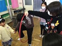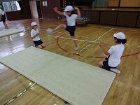 体育の時間に、ゴムを使って高跳びの練習をしました。