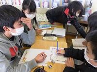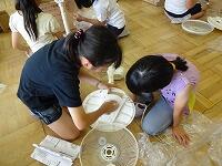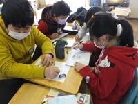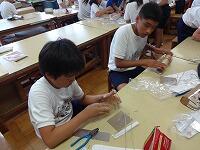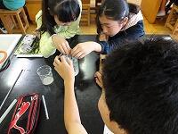 図工の時間に、金属の板や棒を使って、風鈴作りに挑戦しました。慣れないペンチを使って、みんな真剣な表情です。金属板を丸めることは、難しいようです。友達同士で協力して丸めていました。さて、どんな風鈴ができるでしょうか。