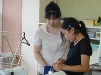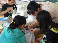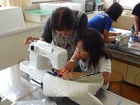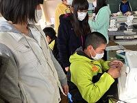家庭科では、ナップザック作りをしています。今日も、ボランティアの先生方がいらっしゃって、先生方に作り方を分かりやすく教えていただきました。