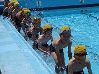小学校のプールに初めて入りました。プールは楽しいけれど、危険でもあるので、始めに約束をしました。1年生は、友達と一緒に遊びながら、楽しく水慣れをしていきたいと思います。