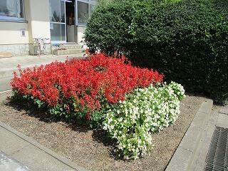 春に、地域の方と植えたサルビアなどの花が、夏の暑さを乗り切り、学校を彩っています。子どもたちが、種から育てた草花もきれいに花をつけました。人権の花もまだ、花をつけています。皆さんのおかげで、学校が花で彩られていてきれいです。