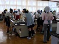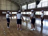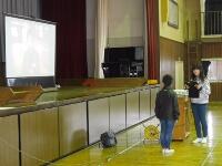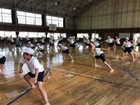 体育館で、5,6年生が何やら見ながら、体を動かしています。