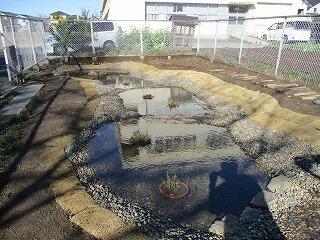 本校の特徴の1つでもあるビオテープ。年月がたち、水の濁りや木の枠の老朽化が見られました。そこで、「学校環境緑化モデル事業」として、ビオトープの改修を行っています。おおよその工事が終わり、新しいビオトープがもう少しで完成です。