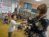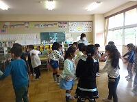 まずは、円になって、音楽が止まったところの人が自己紹介。”Nice to meet you!”