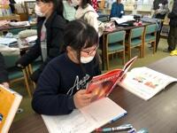 国語の授業で、本を使って自分の立てた問いについて調べています。