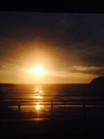 海岸沿いの道で、夕日が祝ってくれているようです。