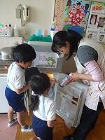 手にデンプンのりを塗って、水で手をあらってみました。上手に洗えているかな?