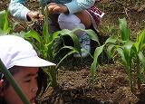 6年生はじゃがいもの世話、2年生はきゅうりやトウモロコシの世話です。