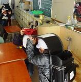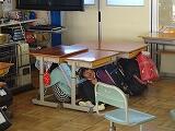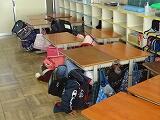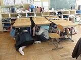 竜巻の襲来が予想されたときは、ガラス飛散による怪我防止のため①カーテンを閉める②ランドセルで頭、体を守る③机でバリケードを作り中に潜る、そして、④竜巻の去るのを待つ、という一連の行動を体験しました。