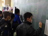 開放された黒板にテーマを書き、それについて子どもたちが意見を書いていきます。