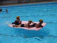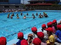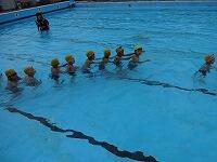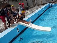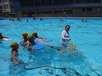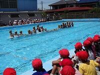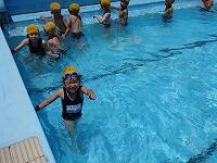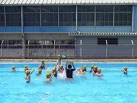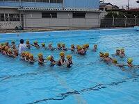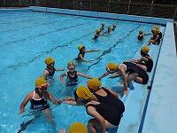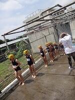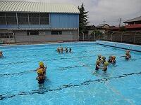 昨日、5年生が洗ってくれたプールで、何かを話している6年生。