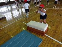 そして、いよいよとび箱を使って、またぎジャンプ。「ドン、シュワッチ。」