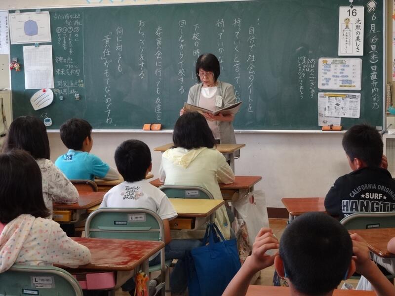 6月9日の朝の読み聞かせの様子です。毎週木曜日の朝に九輪草の会の方に来ていただき