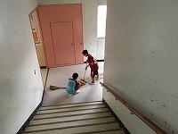 清掃でのお互いのよかったところを体を寄せて、伝え合っています。
