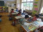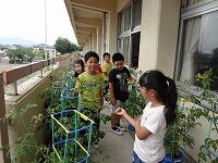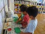 毎日、朝と帰りにお世話をしている野菜たち。とても大きくなりました。ミニトマトは、たくさん実を付け、赤くなるのが楽しみです。ナスやピーマン、オクラ、えだまめ、きゅうりも、大きくなってきました。膨らんできた実が、きらきら輝いて見えます。友達の野菜にも関心があります。同じミニトマトでも、実の形や大きさがいろいろあるのにも、気づきました。いつの間にか、お互いにアドバイスする姿が見られるようになりました。