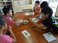 教室に戻って、収穫したばかりのキュウリをスティックにして、塩をかけ、試食。