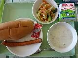 今日のメニューは、ホットドッグ、牛乳、白いんげんのスープ、ゆで野菜です。今日は洋風ですね。