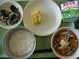 今日のメニューは、ごはん、牛乳、すき焼き風煮、磯香和え、厚焼き卵です。栃木市産の豚肉や宮ネギを使ったふるさとメニューです。