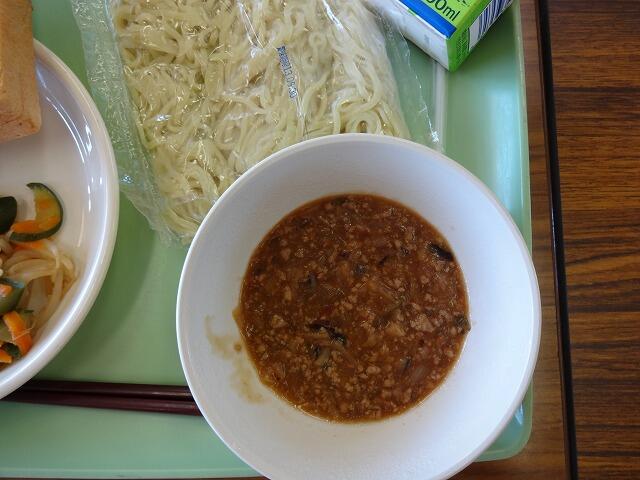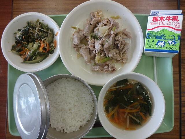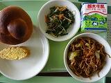 今日のメニューは、ミルクパン、牛乳、ミルメーク、焼きそば、中華風卵焼き、にらのナムルです。ニラは栃木市の特産物です。
