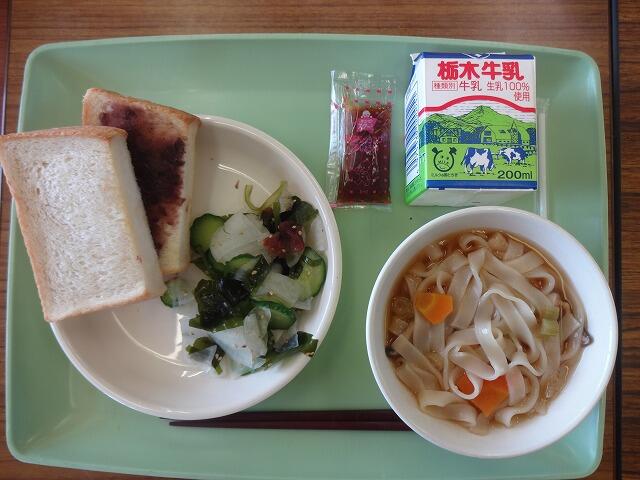 今日の給食は郷土料理メニュー「愛知県バージョン・小倉トーストときし麺」です。
