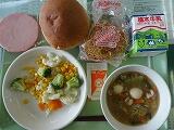 今日の給食は … フィッシュバーガー ゆで野菜 よくばりスープ です!
