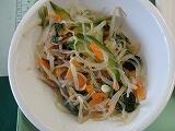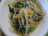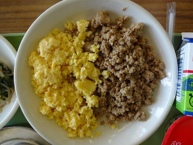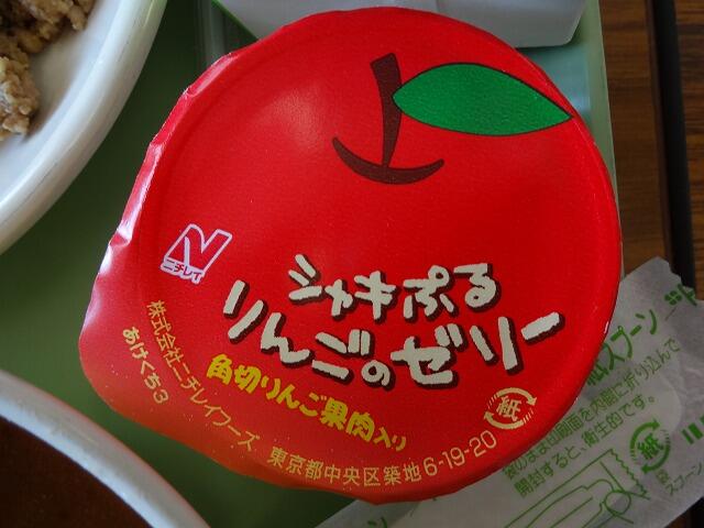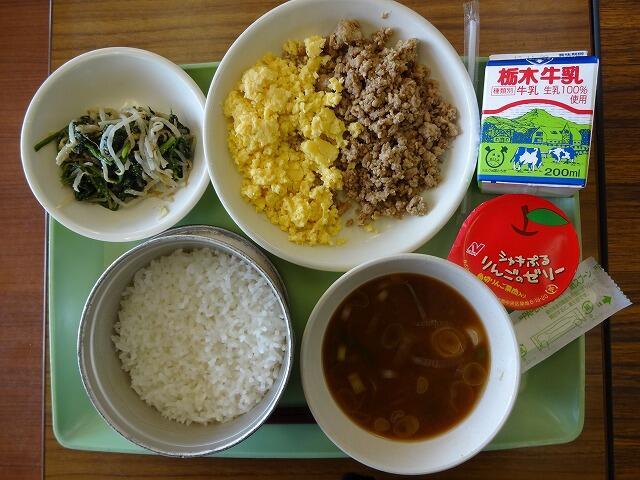 三色丼は、鶏肉のそぼろと炒り卵、もやしとほうれん草のおひたしをご飯の上にのせます。味噌汁のナメコ栃木県産です。リンゴゼリーには、リンゴのカットされたものが入っています。美味しくいただきました。