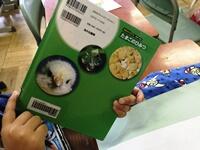 こちらは、田んぼの水の中にいる生き物を、みんなで観察。