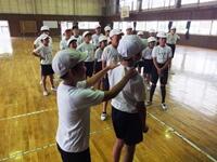 しっかりと柔軟運動に取り組んだ後、一木先生の話を真剣に聞く子どもたち。