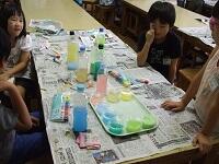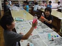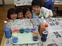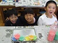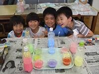 図工の時間に、グループでオリジナルのいろ水をつくりました。いろ水といろ水をまぜて、ふしぎな色をつくり出したグループもありました。