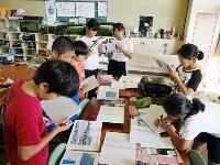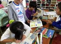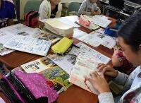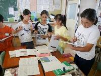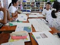台風についてまとめたみんなのノートをじっくり読み、どのようなまとめ方がよいのかを考えています。