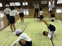 今日の体育では、今まで習ったマット運動の技を組合せ、